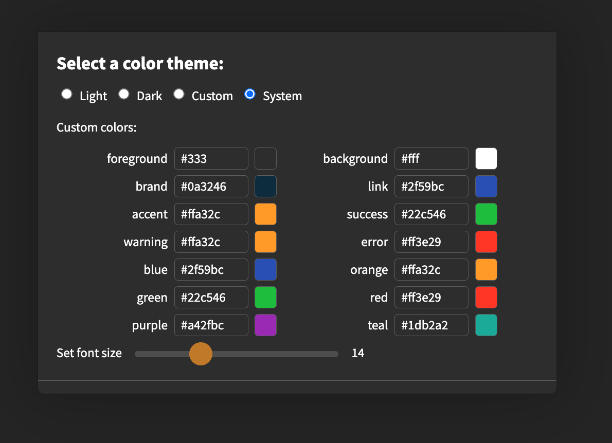 Please note that this will soon change in future versions. We’ve implemented a dynamic color scheme based on some base colors. Preview: